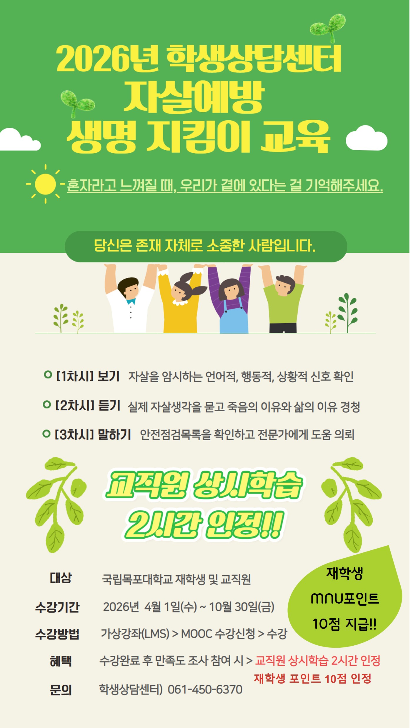 2026년 학생상담센터 자살예방 생명 지킴이 교육 안내