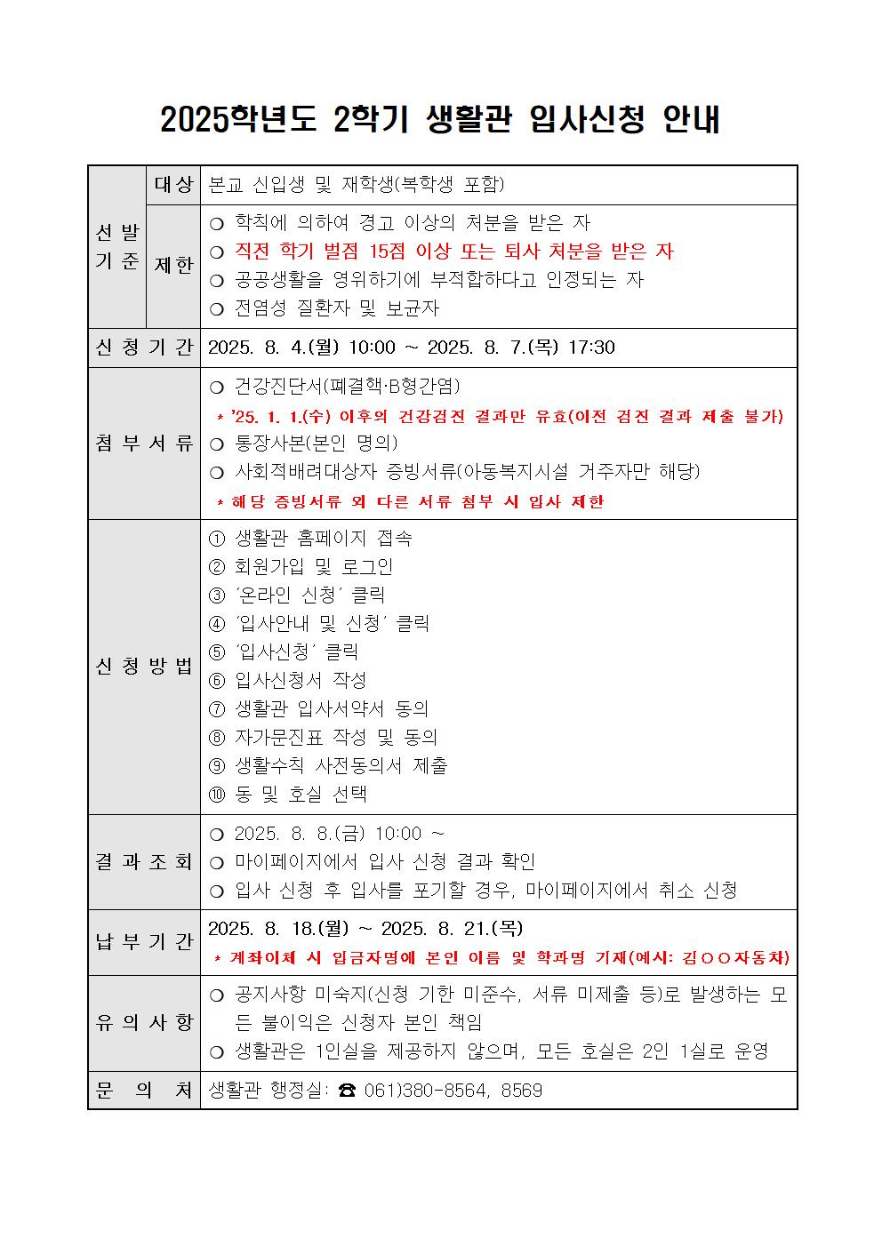 2025학년도 2학기 생활관 화재대피훈련 실시 안내