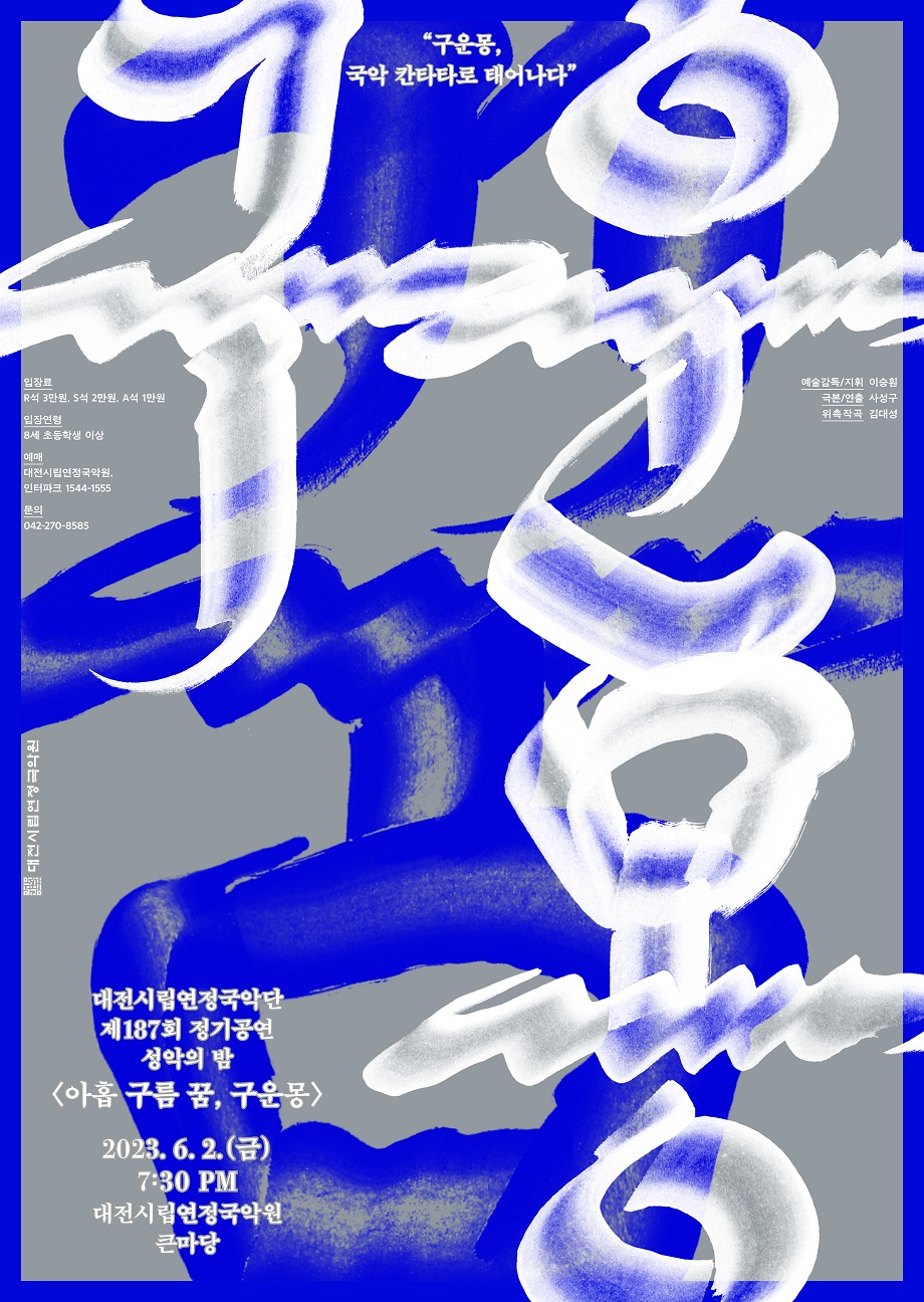 대전시립연정국악단 제187회 정기공연 [성악의 밤 - 아홉 구름 꿈, 구운몽] | 6. 2.(금) 19:30 | 대전시립연정국악원 큰마당 | 8세 이상 | R석 3만원 S석 2만원 A석 1만원 |