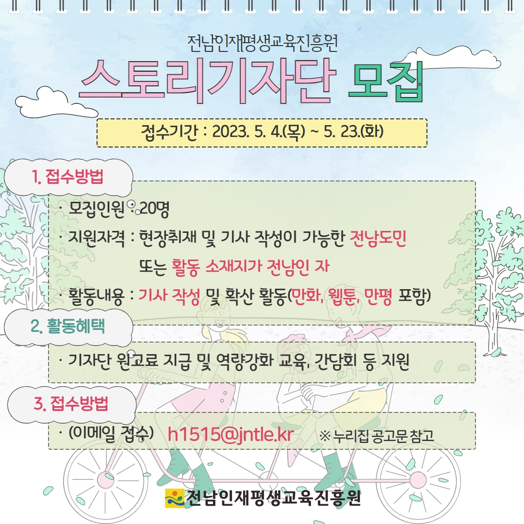 전남인재평생교육진흥원에서는 지역의 다채로운 장학·인재육성·평생교육 소식을 발굴하고 널리 홍보하기 위하여 스토리기자단을 모집 합니다.가. 공 고 명 : 2023년 인평원 스토리기자단 모집나. 접수기간 : 2023. 5. 4.(목) ~ 5. 23.(화)다. 접수방법 : 담당자 이메일(h1515@jntle.kr) 신청※ 공고문 참고