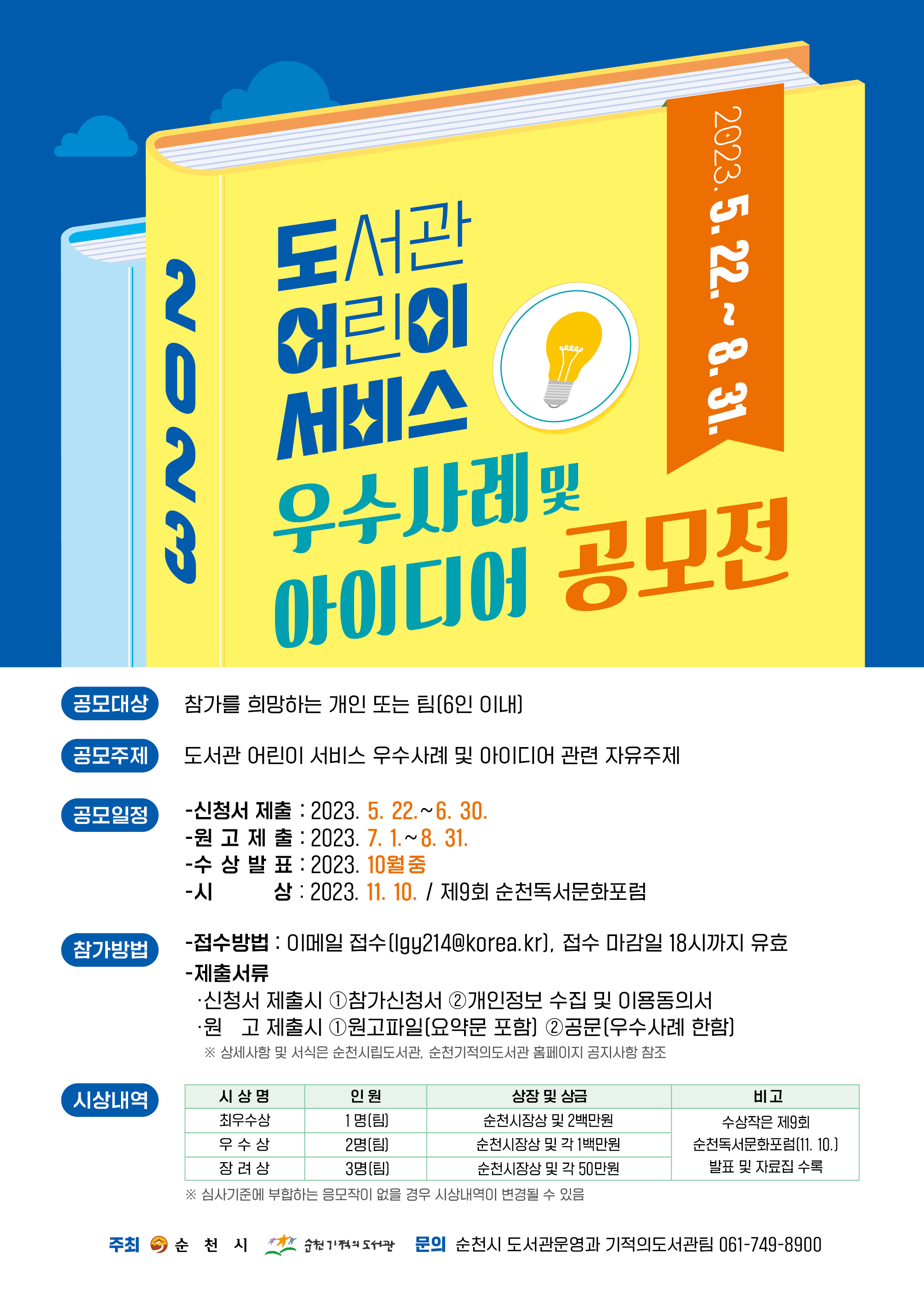 가. 공모전명 : 2023년 도서관 어린이서비스 우수사례 및 아이디어 공모전