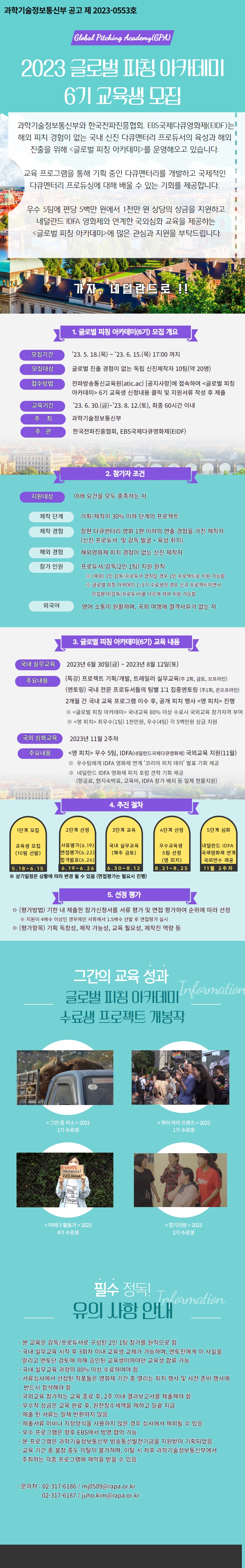 4) 우수 5팀에게 IDFA(암스테르담) 영화제 연계 교육지원(11월), 총상금 3천만원 지원