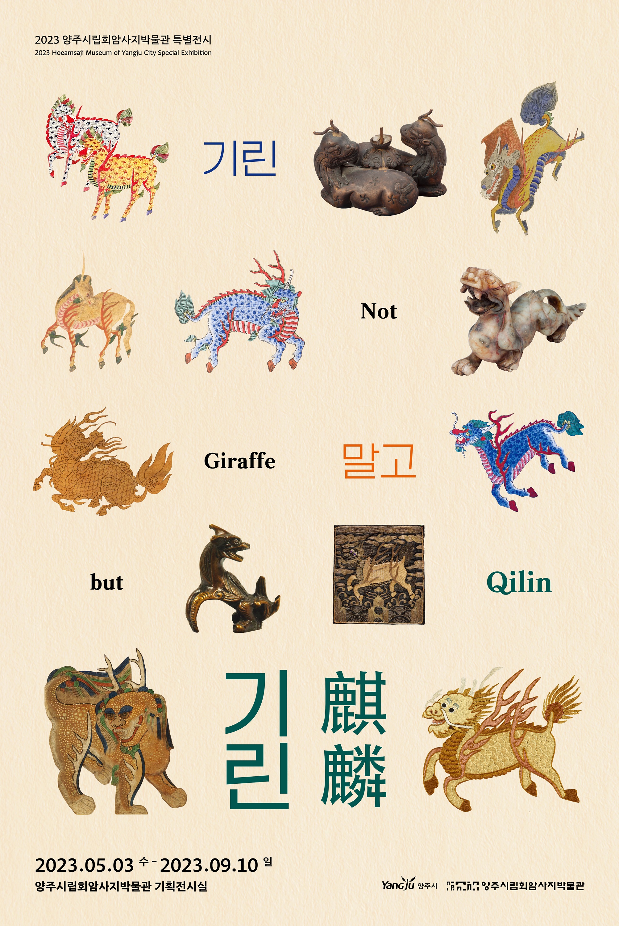 가. 전 시 명 : 기린 말고 기린나. 전시내용 : 상상 속 동물 ‘기린(麒麟)’의 개념 및 유래, 관련 공예품 및 작품 전시다. 전시기간 : 2023. 5. 3.(수) ~ 2023. 9. 10.(일) (매주 월요일 정기휴관)라. 전시장소 : 양주시립회암사지박물관 2층 기획전시실 (양주시 회암사길 11)