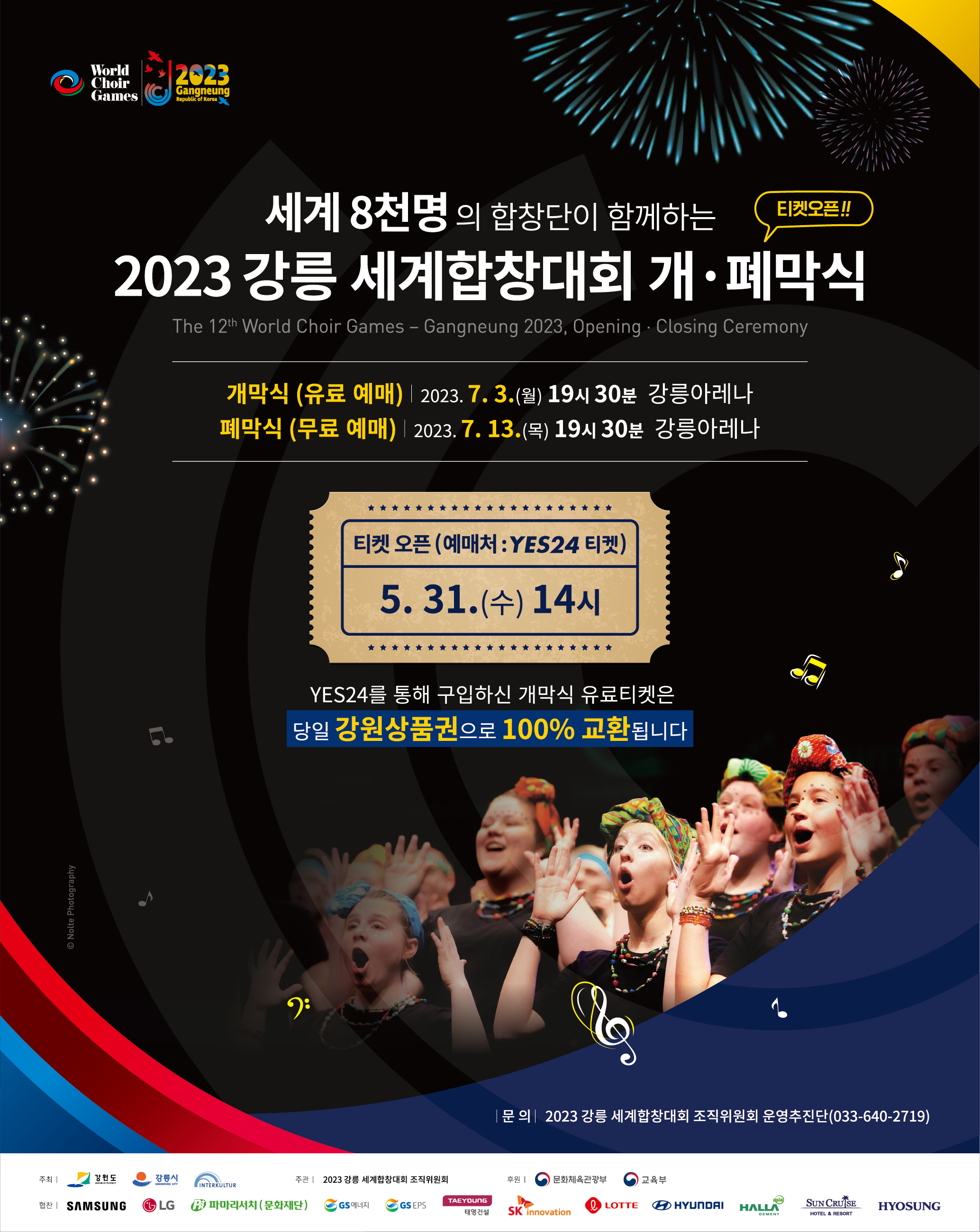 가. 예매기간 1) 개막식(유료 20,000원): 2023. 5. 31.(수) ~ 2023. 6. 23.(금) - 유료예매는 행사당일(7월3일) 좌석표 교부시 20,000원권 강원상품권 지급 2) 폐막식(무료): 2023. 5. 31.(수) ~ 2023. 7. 3.(월)나. 예 매 처: YES 24 티켓