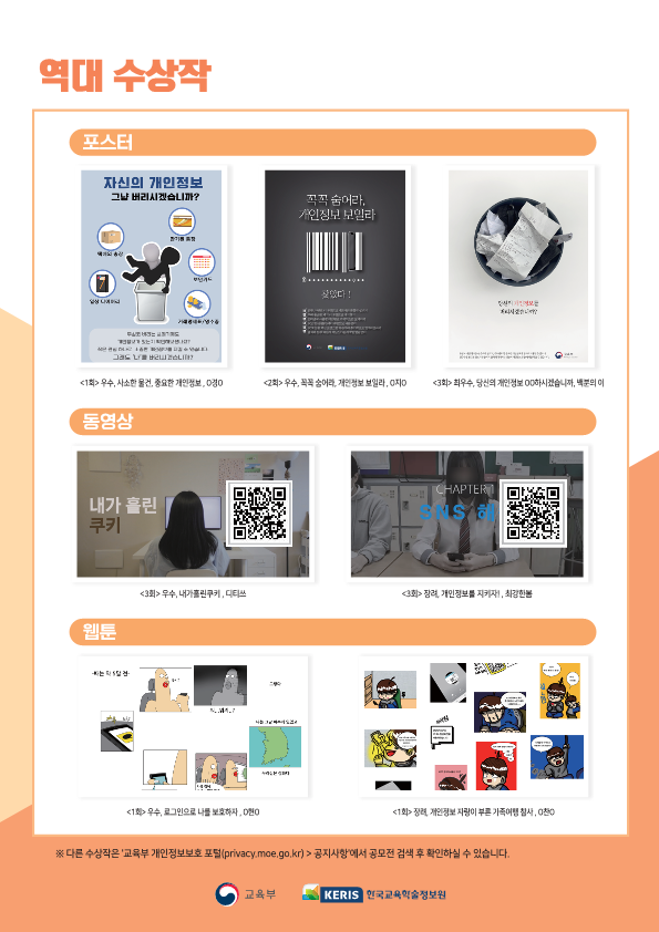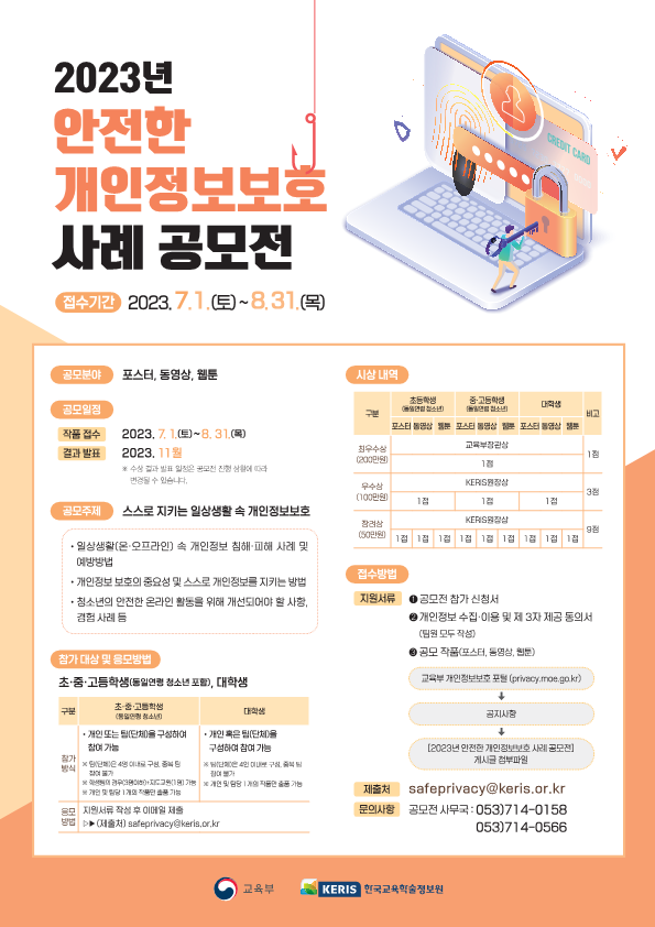 가. 공모주제 : 스스로 지키는 일상생활 속 개인정보보호나. 공모대상 : 전국 초·중·고등학생(동일연령 청소년) 및 대학생다. 공모분야 : 포스터, 동영상, 웹툰라. 공모기간 : 2023. 7. 1.(토)~8. 31.(목)마. 문 의 처 : 한국교육학술정보원 공모전 사무국(☎ 053-714-0158)※ 교육부 개인정보보호 포털(https://privacy.moe.go.kr) 공지사항 참고