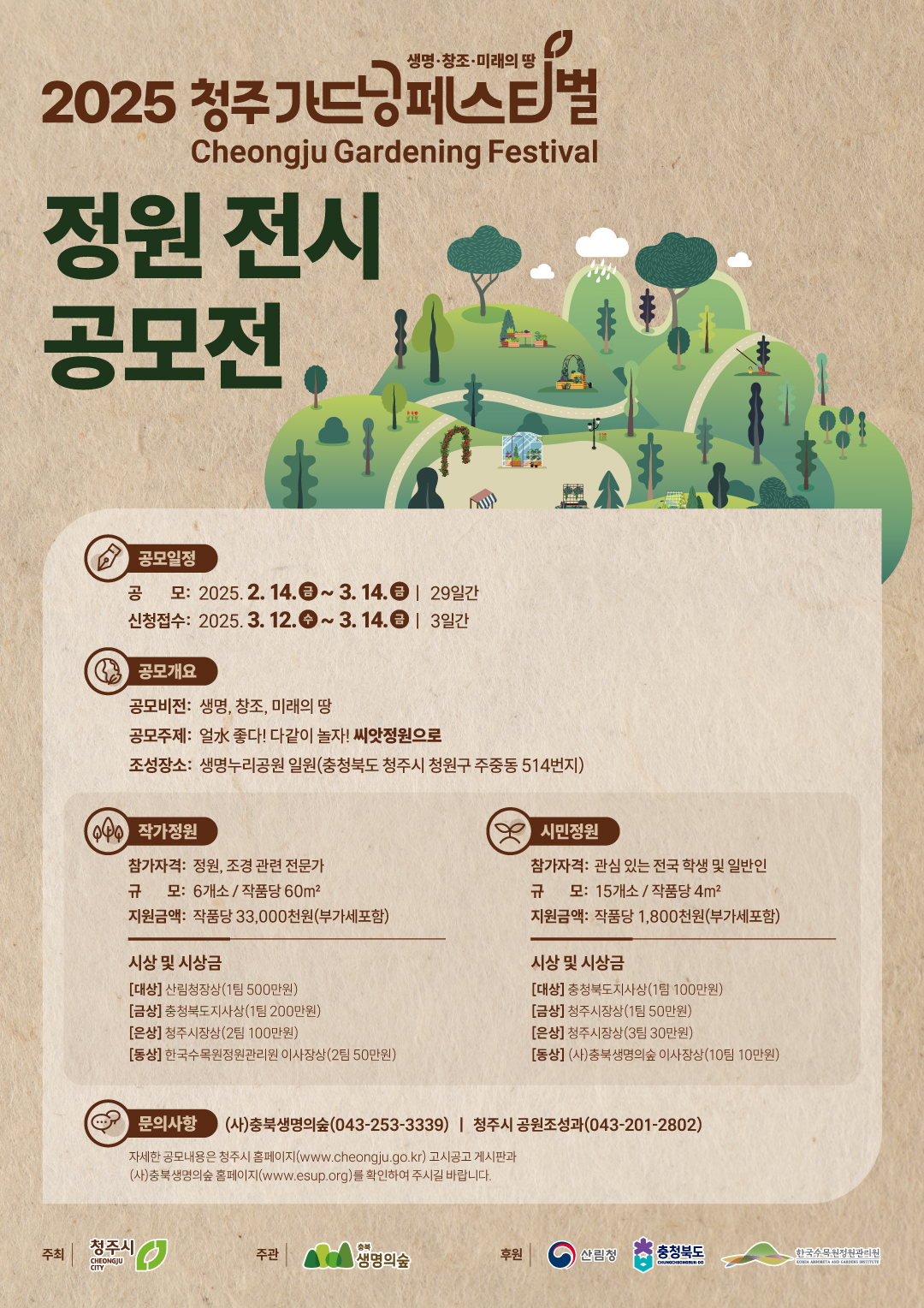 ※ 자세한 공모내용은 붙임 공고문 또는 청주시 홈페이지(www.cheongju.go.kr) 고시공고 게시판과 주관사 (사)충북생명의숲 홈페이지(www.esup.org) 참조